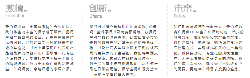 愛伯特家居有限公司屬中外合資企業(yè),成立于2007年,坐落于福建漳州北斗工業(yè)園區(qū),占地66000平方米。對(duì)于板式家具,木質(zhì)家居產(chǎn)品,我們專業(yè)的團(tuán)隊(duì)有著世界頂級(jí)的生產(chǎn)能力,產(chǎn)品原料及品質(zhì)要求符合國(guó)際各類管理體系的標(biāo)準(zhǔn)。愛伯特自創(chuàng)始之日起至今,始終保持超乎尋常的成長(zhǎng)速度。我們與(HomeDepot,Lowes,Aldi,Lidl